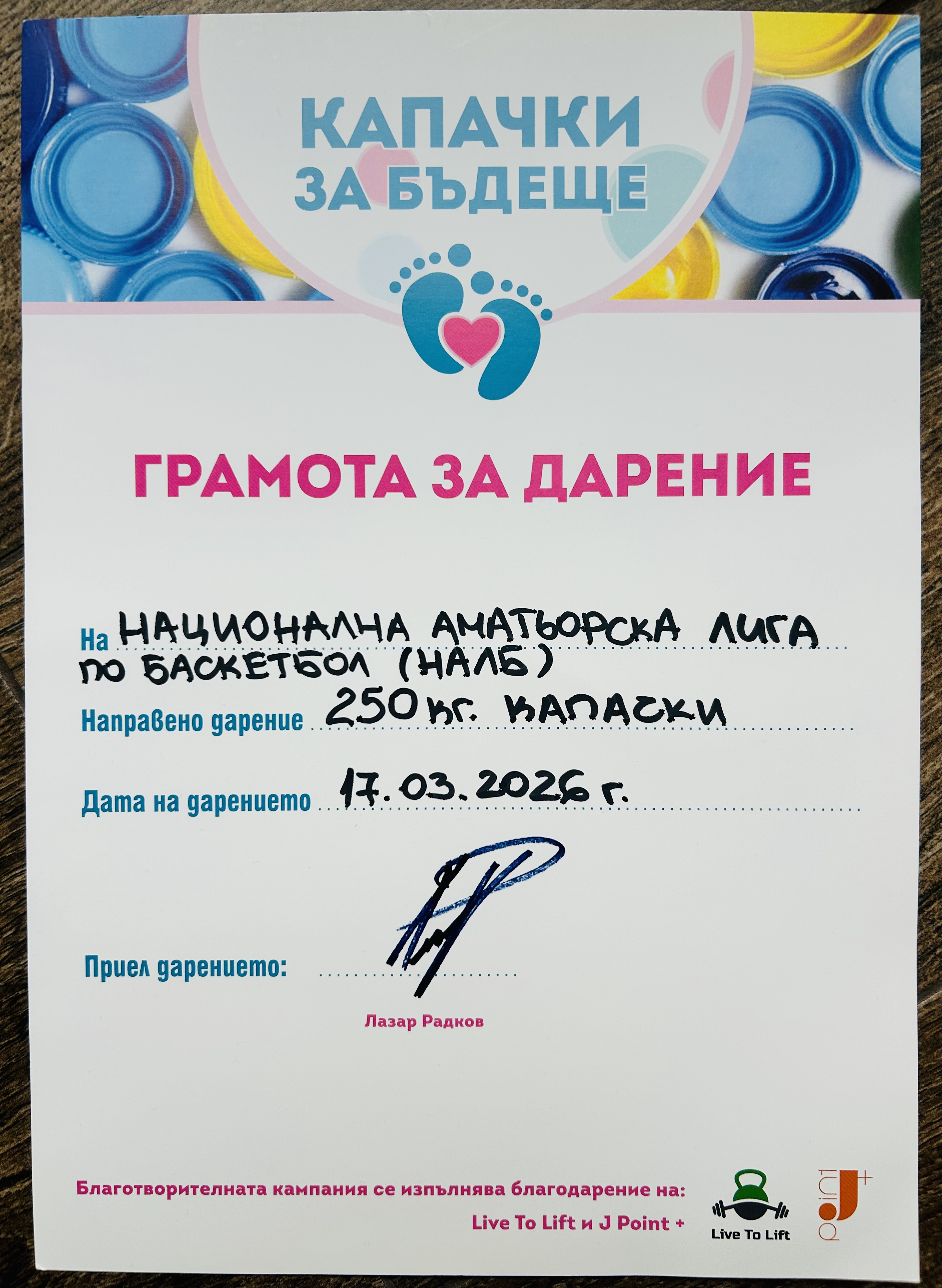 От Националната аматьорска лига по баскетбол се радваме да обявим поредното дарение, което направихме. То беше направено вчера, 17.03.2026 година. Става дума за сериозно количество капачки. След като в продължение на дълги години от НАЛБ подкрепяхме кампанията „Капачки в действие“ (до нейното приключване), знаете, че от години се включваме активно и в кампанията „Капачки за бъдеще“. Целта на кампанията е да бъдат закупени максимално много детски линейки. Както винаги сме споменавали и показвали, с удоволствие ще се включваме все повече и във все повече подобни благородни инициативи.